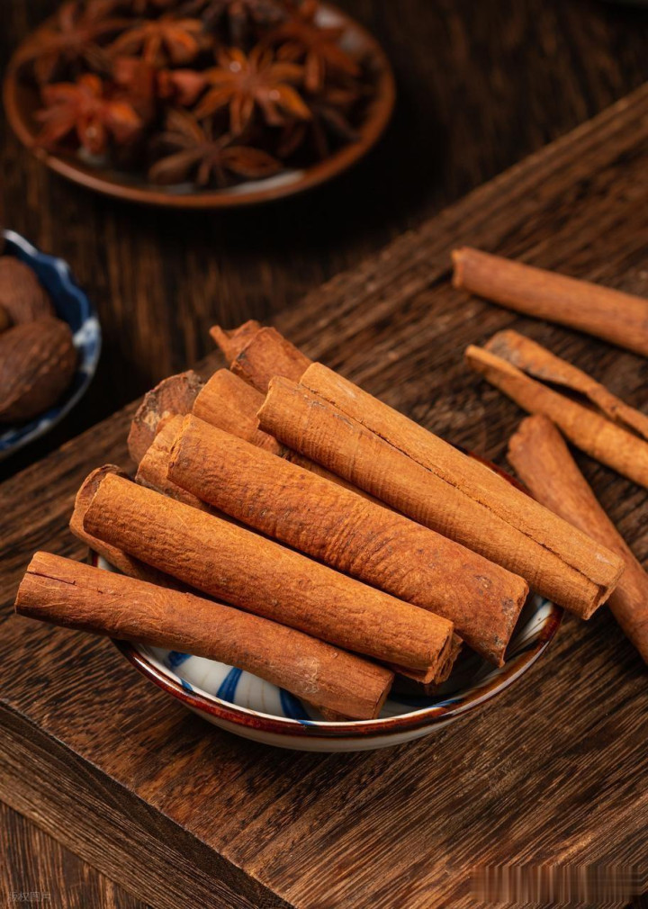 肉桂就是桂树的树皮或枝皮,药食两用,香气浓郁,日常可作香料使用,其辛、甘、大热,入心脾肝肾经,是中药里的多面手,辛可发散行气活血,甘可补益和中,热可温里散寒。